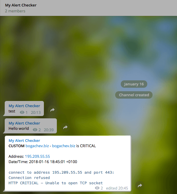 1 2 {"ok" :true ,"result" :{"message_id" :5,"chat" :{"id" :-1001348922431,"title" :"My Alert Checker" ,"type" :"channel" },"date" :1516124394,"text" :"Hello world" }}