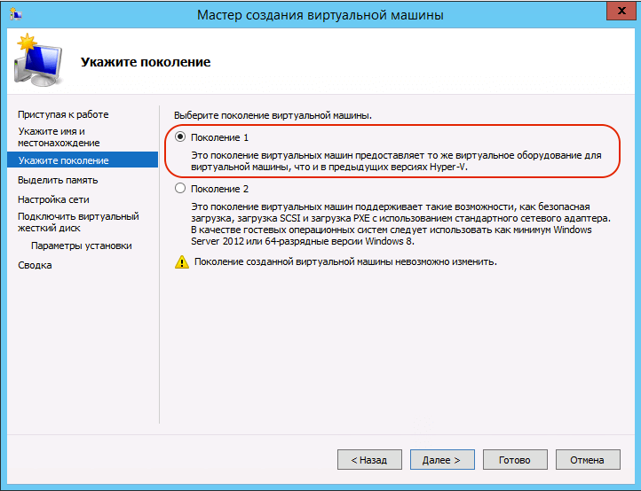 Указываем поколение виртуальной машины. (Выбираем 1-ое поколение, со вторым не работает после конвертации, только для новых ВМ)