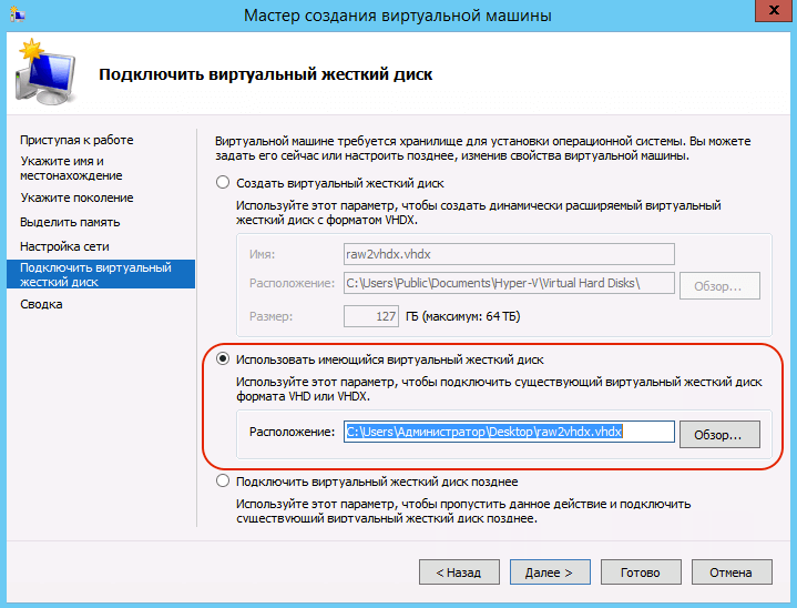 После успешного завершения конвертирования, создаём новый виртуальный сервер с VHDX диском из прошлого шага.