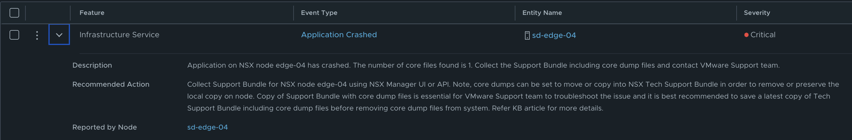 В процессе эксплуатации появилась ошибка Application Crashed на одном из NSX Edge. Службы вышли из строя, и система создала соответствующие файлы дампа памяти. Все службы NSX настроены на автоматический перезапуск после сбоя. В зависимости от приложения, в котором произошел сбой, возможно, что другие службы, зависящие от него, могут работать неправильно. Рекомендуется проверить статус служб, которые вышли из строя, чтобы убедиться, что они работают.