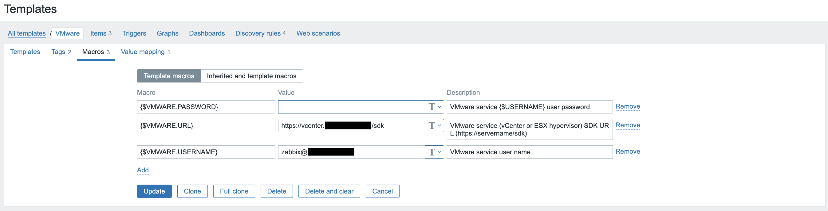 • {$VMWARE.USERNAME} - имя RO пользователя для Zabbix.